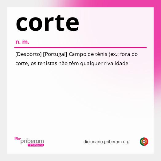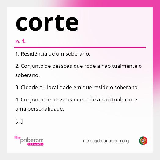 Confrontar: coorte..&definitions[]=%7CIncis%C3%A3o%20ou%20golpe,%20geralmente%20com%20instrumento%20afiado.&definitions[]=%7CLado%20afiado%20de%20faca,%20de%20navalha%20ou%20de%20outro%20instrumento%20cortante,%20por%20oposi%C3%A7%C3%A3o%20%C3%A0%20cota.&definitions[]=%7CTalho%20de%20carne%20feito%20em%20a%C3%A7ougue%20ou%20matadouro.&definitions[]=%7CModo%20como%20se%20corta%20o%20cabelo%20(ex.%3A%20corte%20curto%3B%20corte%20escadeado).&definitions[]=%7CModo%20de%20talhar%20uma%20pe%C3%A7a%20de%20roupa.&definitions[]=%7CPlano%20de%20uma%20constru%C3%A7%C3%A3o.&definitions[]=%7CRepresenta%C3%A7%C3%A3o%20gr%C3%A1fica%20de%20parte%20do%20interior%20de%20um%20objecto%20ou%20de%20um%20espa%C3%A7o%20(ex.%3A%20corte%20longitudinal%3B%20corte%20transversal).&definitions[]=%5BArquitectura%5D%20%5BArquitetura%5D%20%7CCada%20uma%20das%20faces%20da%20aduela%20de%20um%20arco%20de%20edif%C3%ADcio.&definitions[]=%7CPe%C3%A7a%20de%20pano%20suficiente%20para%20um%20objecto%20de%20vestu%C3%A1rio.&definitions[]=%7CDiminui%C3%A7%C3%A3o%20de%20dimens%C3%A3o%20ou%20de%20quantidade%20(ex.%3A%20corte%20or%C3%A7amental).&definitions[]=%7CSupress%C3%A3o,%20elimina%C3%A7%C3%A3o%20(ex.%3A%20corte%20de%20gastos).&definitions[]=%5BEncaderna%C3%A7%C3%A3o%5D%20%7CCada%20uma%20das%20tr%C3%AAs%20superf%C3%ADcies%20exteriores%20formadas%20pela%20reuni%C3%A3o%20das%20folhas%20quando%20o%20livro%20est%C3%A1%20fechado%20(ex.%3A%20corte%20c%C3%B4ncavo%3B%20corte%20de%20cima%3B%20corte%20da%20frente).&definitions[]=%5BPortugal,%20Informal%5D%20%7CPessoa%20que%20estraga%20o%20prazer%20das%20outras.&definitions[]=%5BPortugal,%20Informal%5D%20%7CPessoa%20que%20recua%20ou%20se%20nega%20depois%20de%20ter%20prometido%20ou%20combinado%20algo.&definitions[]=%5BPortugal,%20Informal%5D%20%7CH%C3%A1bito%20de%20censurar%20ou%20de%20dizer%20mal%20de%20pessoas%20ou%20coisas%20(ex.%3A%20ele%20passa%20a%20vida%20no%20corte).&definitions[]=%5BG%C3%ADria%5D%20%7CRoubo.&definitions[]=%5BBrasil%5D%20%7CPassagem%20aberta%20atrav%C3%A9s%20de%20um%20morro.&definitions[]=%5BEncaderna%C3%A7%C3%A3o%5D%20%7CSuperf%C3%ADcie%20exterior%20do%20livro%20que%20se%20op%C3%B5e%20%C3%A0%20lombada.&definitions[]=%5BEncaderna%C3%A7%C3%A3o%5D%20%7CCorte%20do%20livro%20que%20serve%20de%20suporte%20de%20decora%C3%A7%C3%A3o.&definitions[]=%5BEncaderna%C3%A7%C3%A3o%5D%20%7CCorte%20do%20livro%20que%20levou%20uma%20camada%20uniforme%20de%20tinta.)