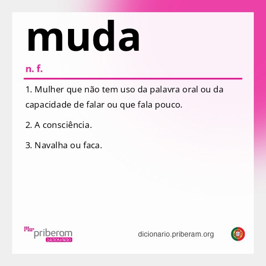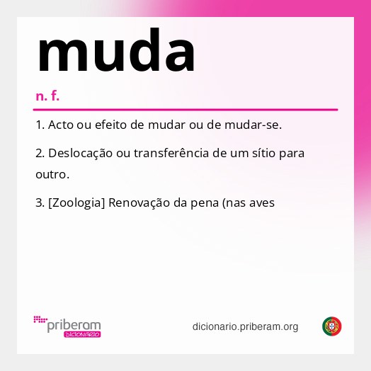 Confrontar: moda.,%20da%20pele%20ou%20do%20pelo%20(em%20certos%20animais).&definitions[]=%5BZoologia%5D%20%7C%C3%89poca%20em%20que%20essa%20renova%C3%A7%C3%A3o%20acontece.&definitions[]=%7CSubstitui%C3%A7%C3%A3o%20de%20cavalos%20ou%20muares%20cansados%20por%20outros%20folgados%20e%20colocados%20de%20dist%C3%A2ncia%20a%20dist%C3%A2ncia%20(ex.%3A%20adormeceu%20na%20caleche%20e%20s%C3%B3%20acordou%20na%20muda).&definitions[]=%7CLugar%20onde%20se%20faz%20essa%20substitui%C3%A7%C3%A3o.&definitions[]=%7CMudan%C3%A7a%20de%20voz%20que%20acontece%20na%20adolesc%C3%AAncia.&definitions[]=%5BHorticultura%5D%20%7CPlanta%20tirada%20do%20viveiro%20para%20planta%C3%A7%C3%A3o%20definitiva.&definitions[]=%7CConjunto%20de%20pe%C3%A7as%20de%20roupa%20para%20algu%C3%A9m%20poder%20mudar%20de%20vestu%C3%A1rio%20(ex.%3A%20muda%20de%20roupa%3B%20trouxe%20duas%20mudas%20para%20as%20crian%C3%A7as).)