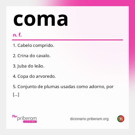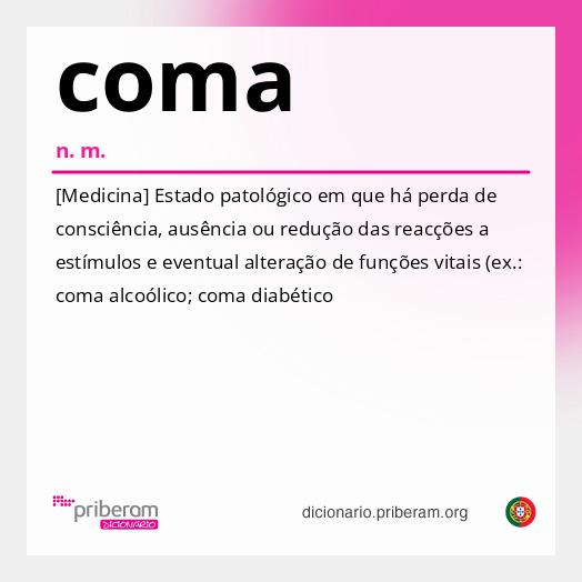 1. [Medicina] [Medicina] Estado patológico em que há perda de consciência, ausência ou redução das reacções a estímulos e eventual alteração de funções vitais (ex.: coma alcoólico; coma diabético).
