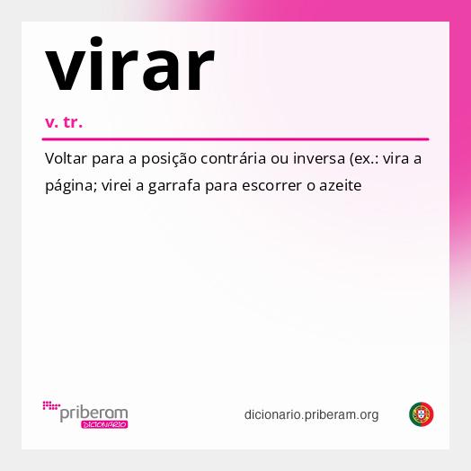 .&definitions[]=%7CP%C3%B4r%20do%20avesso%20(ex.%3A%20virar%20a%20camisola).&definitions[]=%7CVoltar%20ou%20mover%20para%20um%20lado%20ou%20para%20uma%20posi%C3%A7%C3%A3o%20diferente%20(ex.%3A%20vira%20mais%20o%20espelho).&definitions[]=%7CVoltar%20para%20cima%20(ex.%3A%20virar%20as%20cartas%20do%20jogo).&definitions[]=%7CVoltar,%20volver%20de%20um%20lado%20para%20o%20outro.&definitions[]=%7CDirigir%20ou%20apontar%20numa%20direc%C3%A7%C3%A3o%20(ex.%3A%20vira%20a%20faca%20para%20o%20outro%20lado).&definitions[]=%7CDar%20volta%20a%20(ex.%3A%20Bartolomeu%20Dias%20virou%20o%20Cabo%20da%20Boa%20Esperan%C3%A7a).&definitions[]=%7CDespejar%20o%20conte%C3%BAdo%20(ex.%3A%20o%20c%C3%A3o%20vira%20a%20ta%C3%A7a%20da%20%C3%A1gua).&definitions[]=%5BInformal%5D%20%7CBeber%20todo%20o%20conte%C3%BAdo%20(ex.%3A%20viraram%20uma%20garrafa%20num%20instante).&definitions[]=%7CRevirar,%20revolver%20(ex.%3A%20o%20arado%20vira%20a%20terra).&definitions[]=%5BFigurado%5D%20%7CFazer%20mudar%20ou%20mudar%20de%20opini%C3%A3o,%20de%20ten%C3%A7%C3%A3o,%20de%20partido,%20de%20intento%20(ex.%3A%20aqueles%20argumentos%20viraram%20a%20assembleia%3B%20ele%20disse%20uma%20coisa,%20mas%20agora%20virou%20e%20diz%20outra).&definitions[]=%7CMudar%20de%20direc%C3%A7%C3%A3o,%20de%20rumo%20(ex.%3A%20vamos%20em%20frente%20e%20depois%20viramos%20%C3%A0%20direita).&definitions[]=%7COlhar%20para%3B%20estar%20voltado%20para.&definitions[]=%7CFazer%20um%20movimento%20para%20uma%20posi%C3%A7%C3%A3o%20inversa%20ou%20diferente%20da%20anterior%20(ex.%3A%20vire-se%20para%20o%20outro%20lado,%20para%20vermos%20melhor).&definitions[]=%7CLevantar-se%20ou%20reagir%20contra%20algo%20ou%20algu%C3%A9m%20(ex.%3A%20viraram-se%20contra%20a%20autoridade).&definitions[]=%7CDirigir-se%20a%20algu%C3%A9m%20para%20pedir%20aux%C3%ADlio.&definitions[]=%7CEntregar-se%20ou%20dedicar-se%20a%20determinada%20actividade%20(ex.%3A%20ficou%20desempregado%20e%20virou-se%20para%20a%20agricultura).&definitions[]=%7CTentar%20resolver%20dificuldades%20(ex.%3A%20ele%20agora%20tem%20de%20se%20virar%20sozinho).&definitions[]=%5BBrasil%5D%20%7CTornar-se,%20transformar-se%20(ex.%3A%20a%20lagarta%20virou%20borboleta).)
